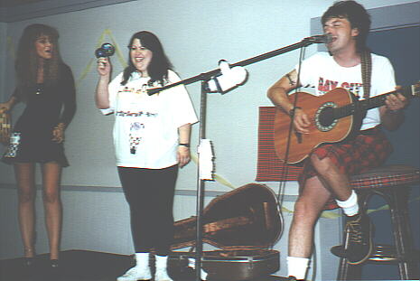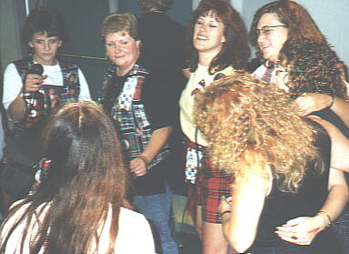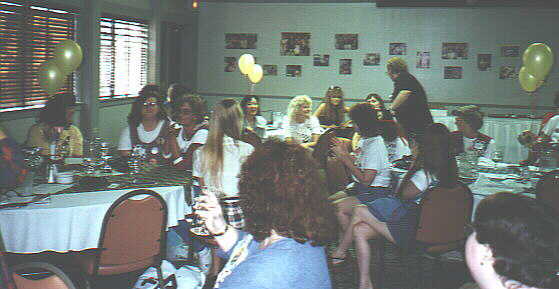 Saturday! Here it comes..... As soon as we got our breakfast and showers out of the way, we were off to the banquet room to get ready for the big showdown at 3pm! Mary Sue came in and helped us hang up all the posters that Sharon had given us. Mary Sue, great job! I didn't realize until much later how nice all those posters looked on the wall, all spaced perfectly and hanging straight. Sandy and Julie helped us fill balloons, and Julie also helped me hang up the streamers and plaid paper that kept falling down!! I know there were other people there helping us set up, but I don't remember who all was there. Thanks to all of you who showed up to help us!! It was a lot more work setting up than we had anticipated!! Ian and Craig came in at about 2 pm to do their sound check. I decided that I wanted to get out of there at that point, I didn't want to be in the back of the room making noise while they were practicing, so we went out and got our stuff set up outside the door.