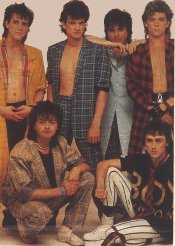 This time I spoke to them in the dimness of a pub. I couldn't help thinking aloud that not so long ago, fans would have killed for a chance to be sitting sipping coffee with THEM... Leslie McKeown (lead singer), Eric Faulkner (manager and accoustic guitar), Pat McGlynn (bass guitar), Ian Mitchell (accoustic guitar), George Spencer (drummer) and "Woody" - Stuart Wood (pianist).